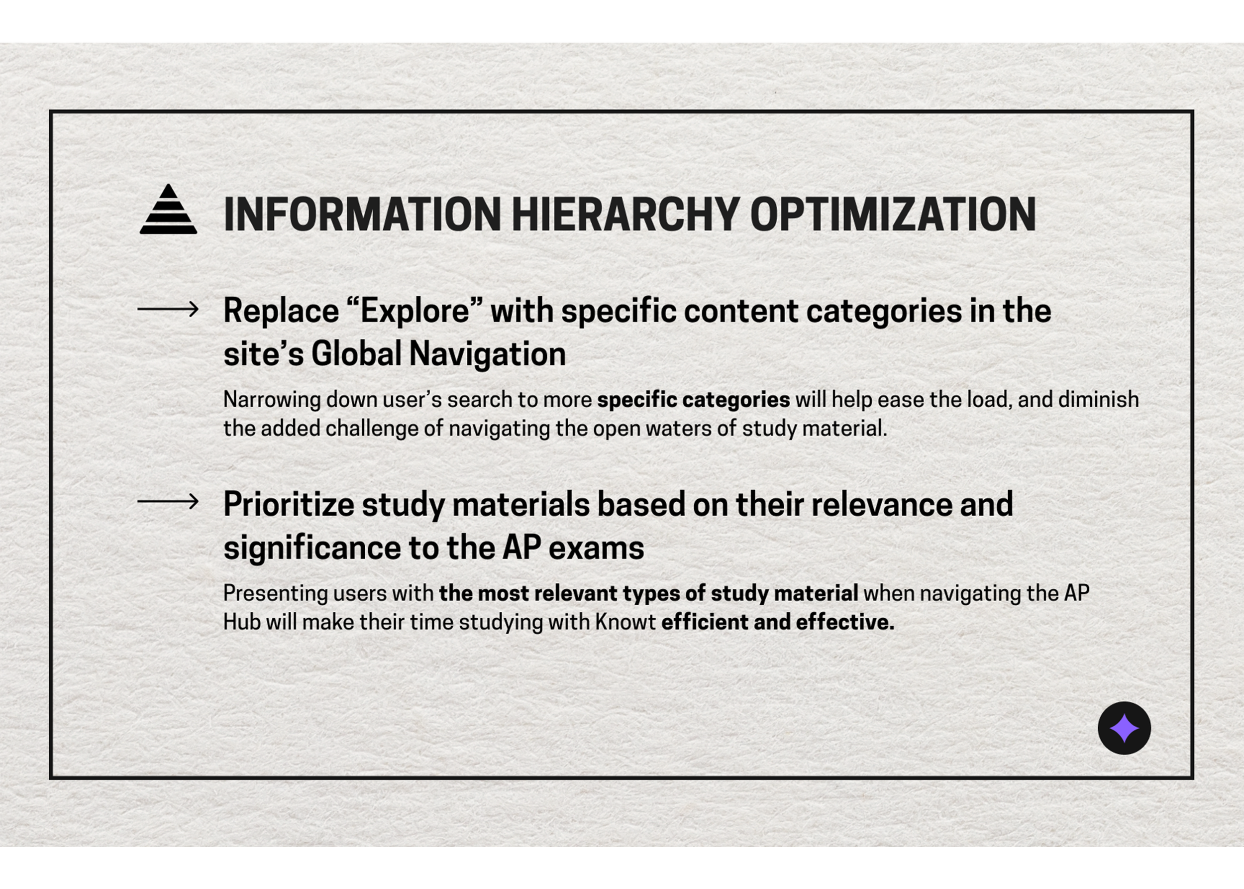 To better empathize with Knowt’s users and understand their context and background, I created a user persona, highlighting the user’s interests, goals, expectations, and pain points to get a more tangible sense of where to direct my website evaluation. From here, I knew efficiency was key to account for a student’s perhaps busy schedule, so prioritizing navigation and information hierarchy would be essential (this will be expanded on in the design rationale).